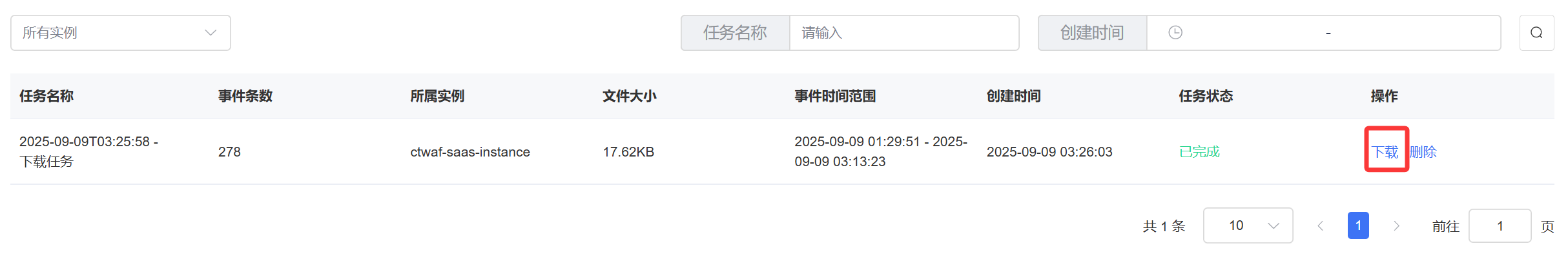 在查询防护事件模块添加下载任务后,可在事件下载页面查看下载任务的任务状态,若任务状态为已完成即可单击操作列的“下载”按钮下载事件报告。