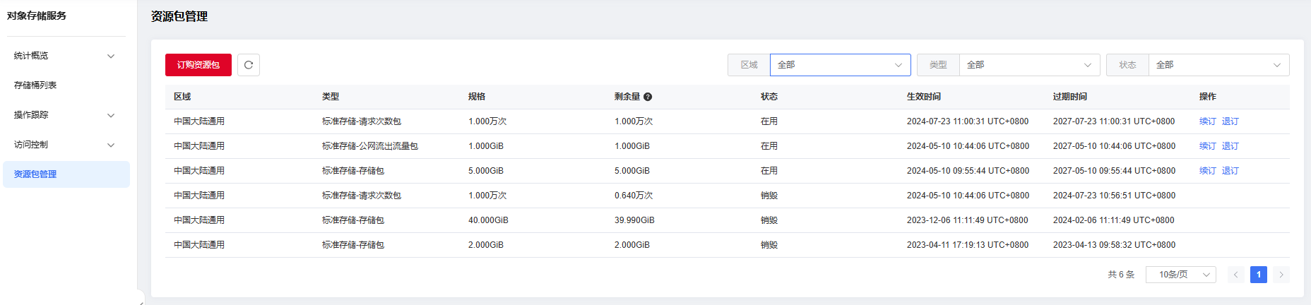 在“资源包管理”页面,可以查看已经订购的OOS资源包,订购新的资源包,或者对已有资源包进行续订、退订操作。具体操作参见快速入门-服务开通。