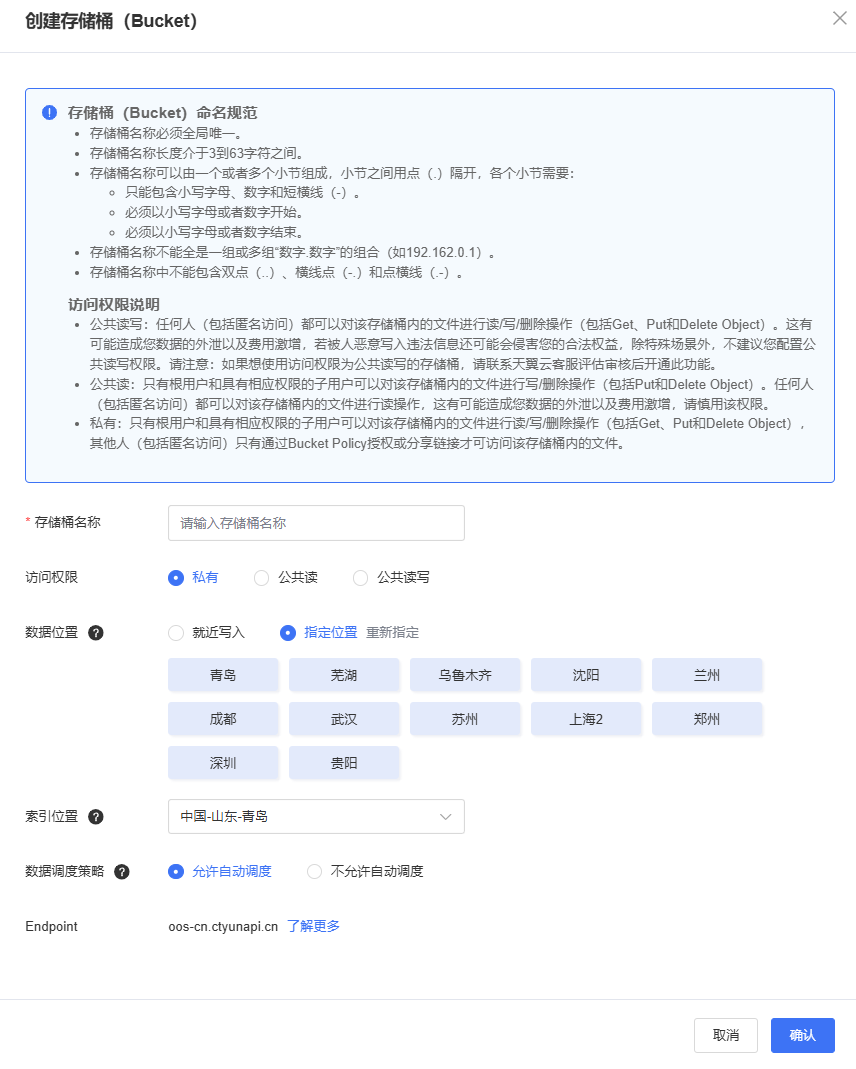 点击“存储桶列表”>“创建存储桶(Bucket)”,输入存储桶名称,并设置访问权限、数据位置、索引位置 、数据调度策略。