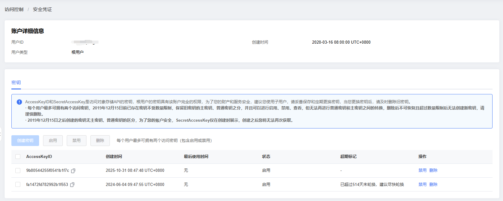 点击“访问控制”>“安全凭证”,可以查看账户详细信息和密钥、对密钥进行操作。账户详细信息包括:用户ID、创建时间、用户类型、密钥。