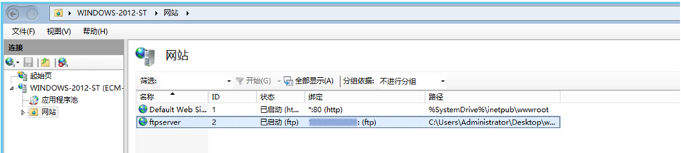 点击“ 服务器管理器 -> 工具 -> Internet Information Services(IIS)管理器” ,然后选择左边栏点击“ 网站” 。首先查看建立的FTP绑定的IP是否填写的是内网IP,类型为FTP。图1 查看FTP所绑定的IP