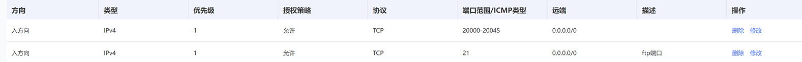 点击“ 控制中心 -> 服务列表 -> 弹性云主机” ,选择对应的可用区,然后再展示出来的弹性云主机列表里选择需要的弹性云主机,然后双击这个弹性云主机,即可打开详情页面。在下方选择“ 安全组” ,然后查看详细的安全组配置,是否在入方向里已经正确配置了端口21和上面配置的数据通道端口这两条。图3 安全组配置