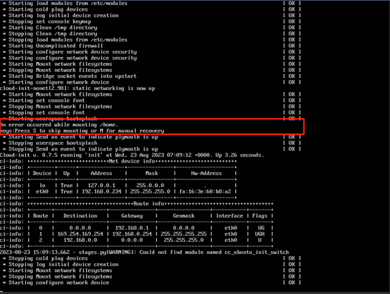 启动时根据如图1所示的提示语“keys:Press S to skip mounting or M for manual recovery”,输入S直接跳过挂载故障进入弹性云主机登录系统页面,输入M进入如图2所示的紧急模式登录页面,并提示输入root密码进行维护。