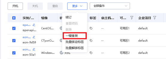 - 如果需要批量云主机重装系统,勾选多个云主机实例,选择云主机列表上方的“更多”选项,选择“一键重装”。