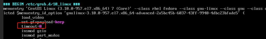 打开文件/boot/grub2/grub.cfg,并修改等待时间“timeout=0”(打开方式可通过vi或者vim)。