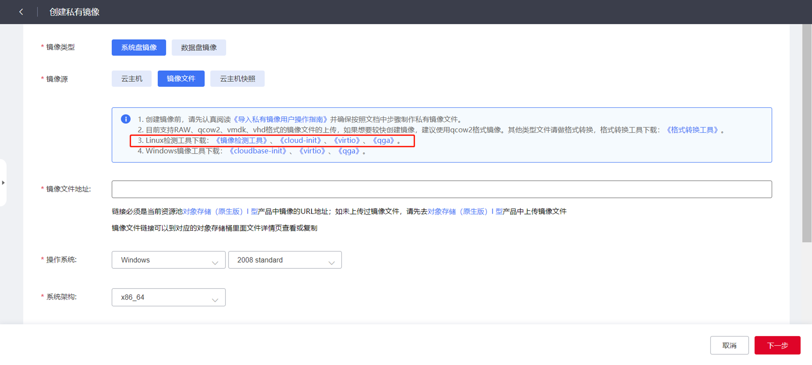 下载路径在“镜像服务”>“私有镜像”>“创建私有镜像”页面中连接下载。