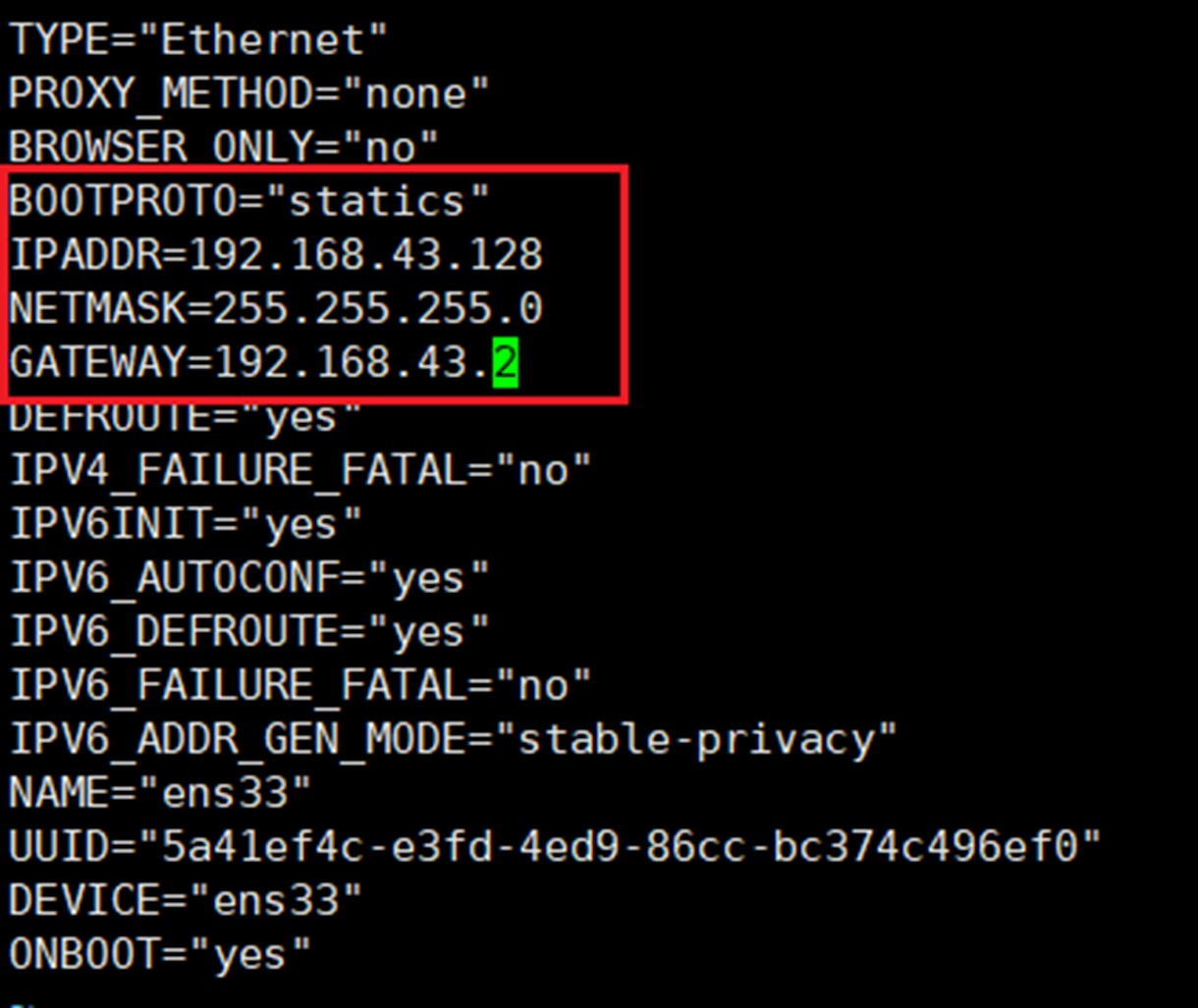 systemctl stop NetworkManager && systemctl disable NetworkManager vim /etc/sysconfig/network-scripts/ifcfg-ens33在配置文件中修改IP如下图后保存。