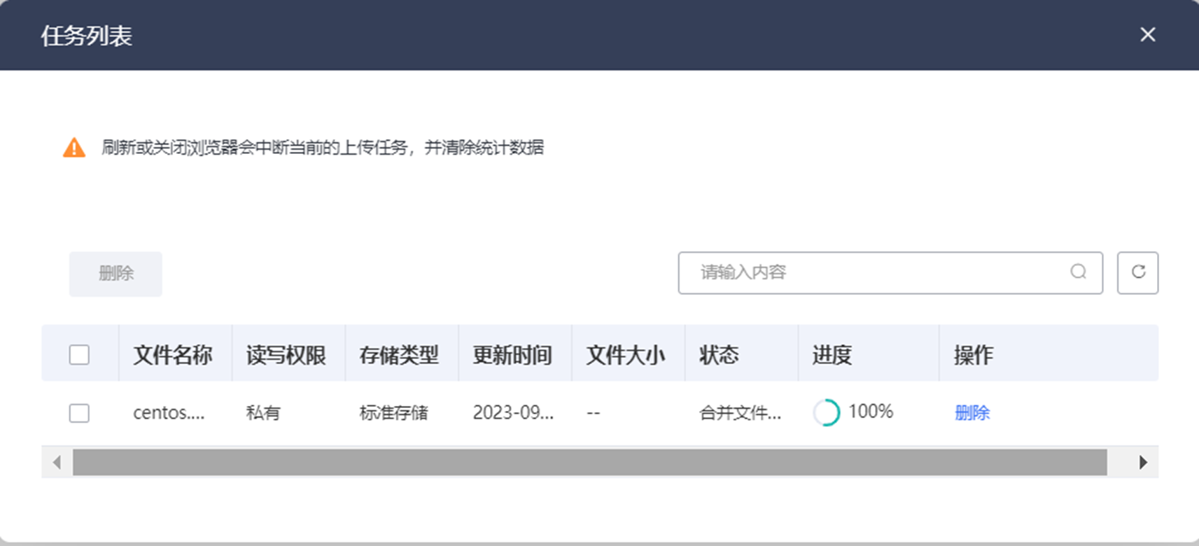 进入对象存储原生版,创建桶后,上传镜像到桶中(镜像较大建议通过oss api上传)。