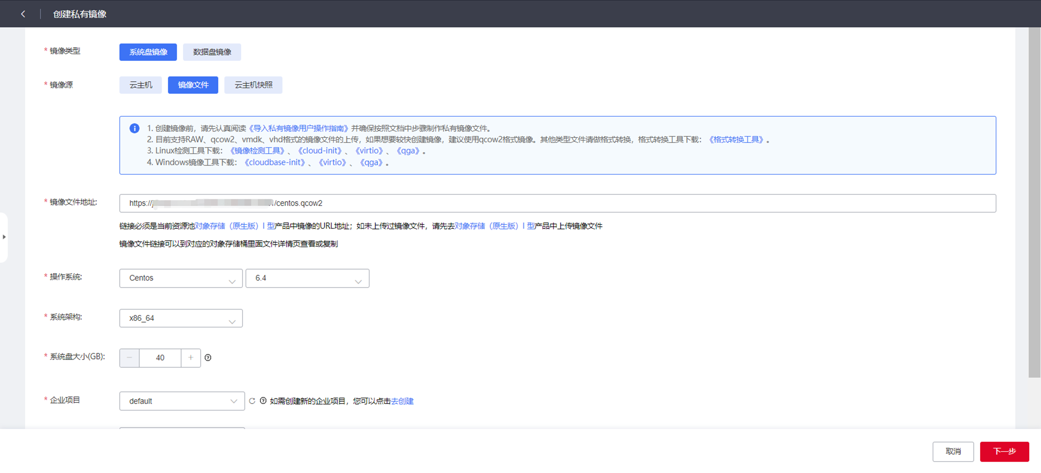 通过“镜像服务”>“私有镜像”>“创建私有镜像”,选择镜像文件并填写对象的地址,然后转为私有镜像。