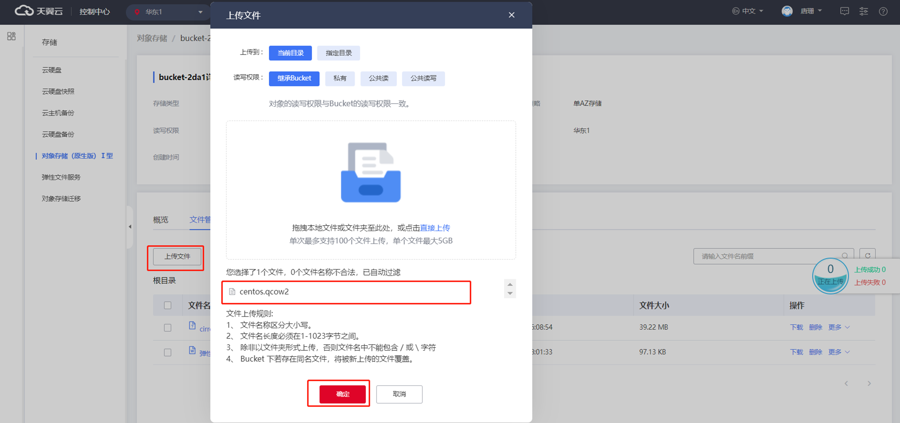 qemu-img convert -f raw -o qcow2 cytestimg centos.qcow2将镜像上传到天翼云。