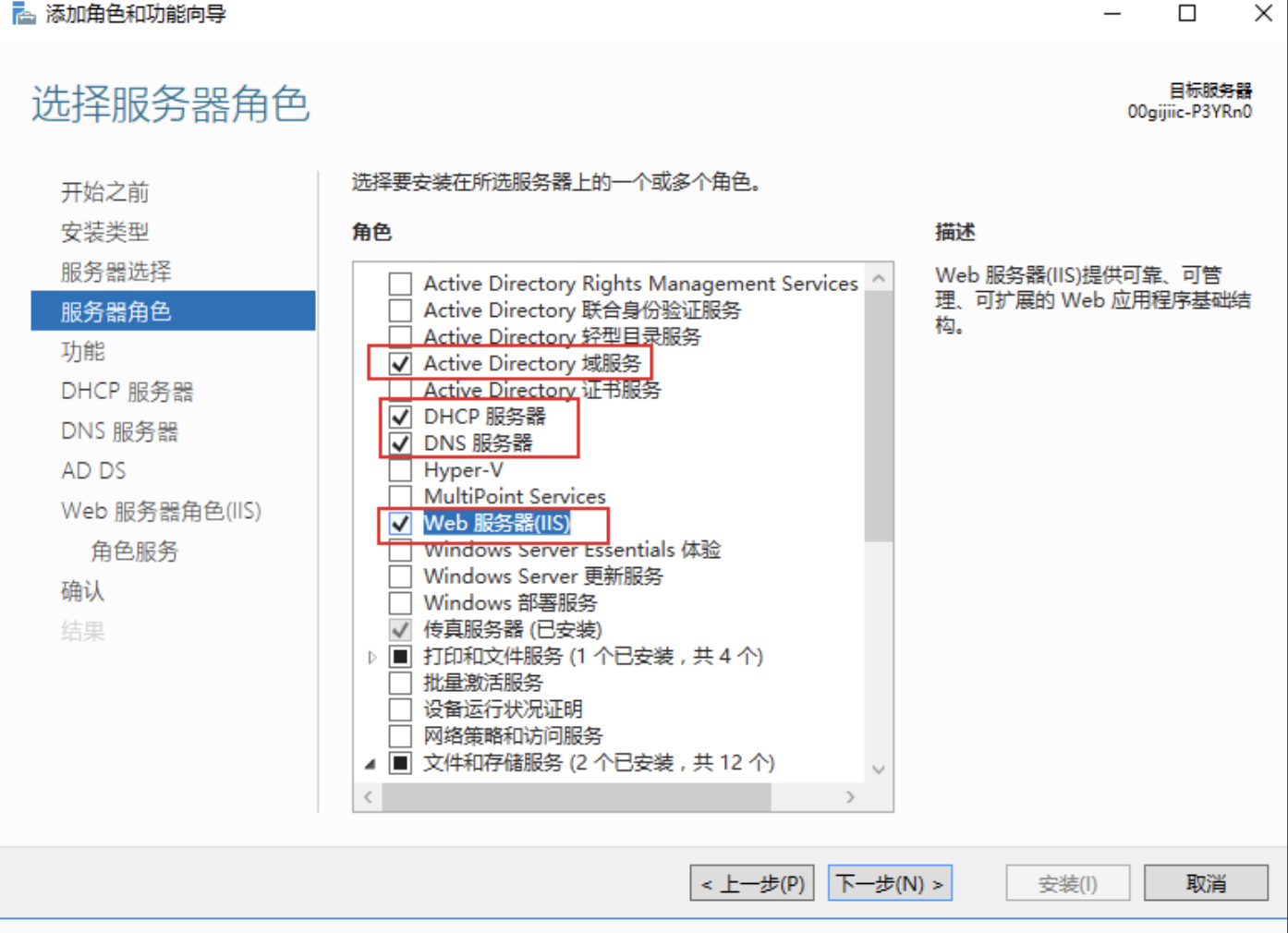 在“服务器角色”导航栏中,勾选“Active Directory 域服务”、“DHCP 服务器”、“DNS 服务器”和“Web 服务器(IIS)”。