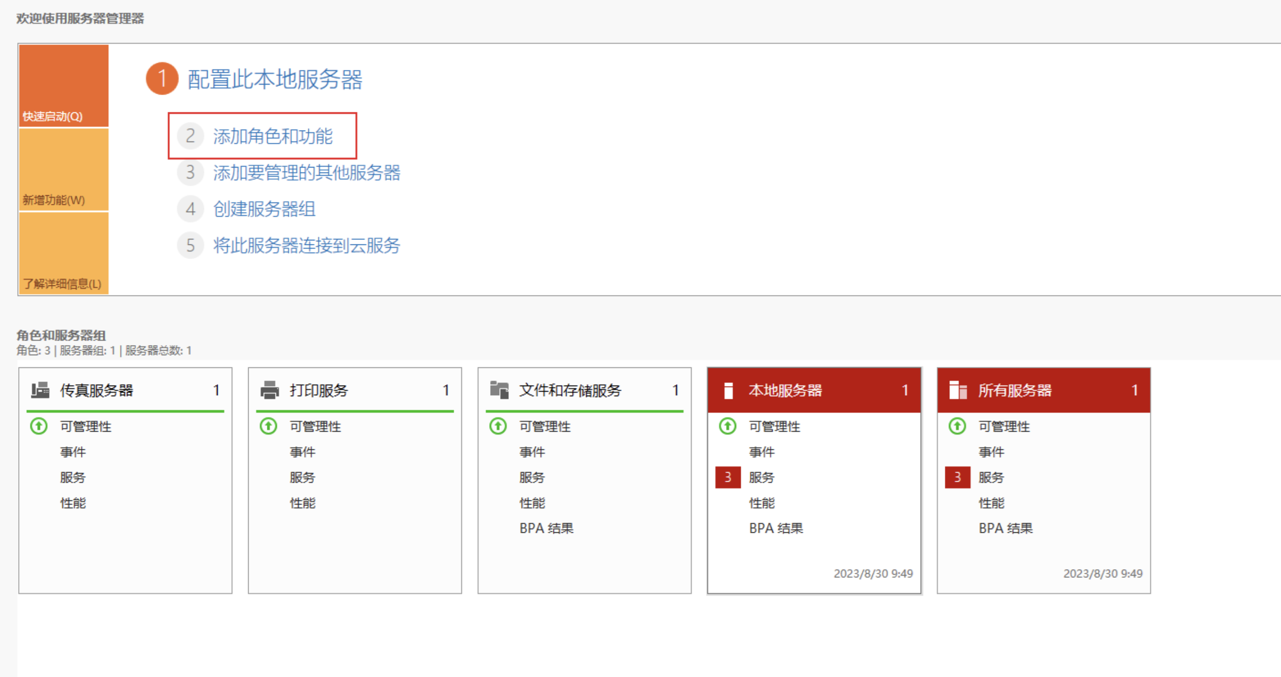 单击“添加角色和功能”,为服务器添加新的角色和功能,包括DNS、DHCP、IIS、NET Framework3.5。