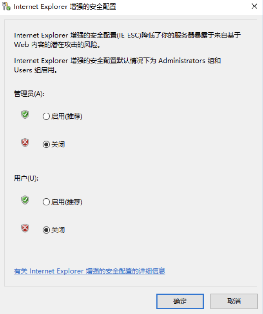 打开“服务器管理器”, 点击“本地服务器”, 选择对应的“关闭”选项,之后点击“确定”完成配置。