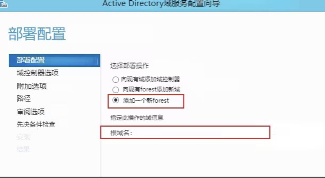 因为没有已经存在的域环境,选择“添加一个新forest”,创建一个新的forest并设置根域名。如“根域名”可以设置为“sp160.com.cn”。