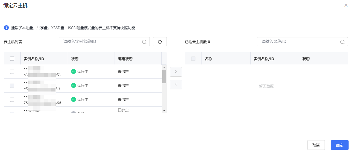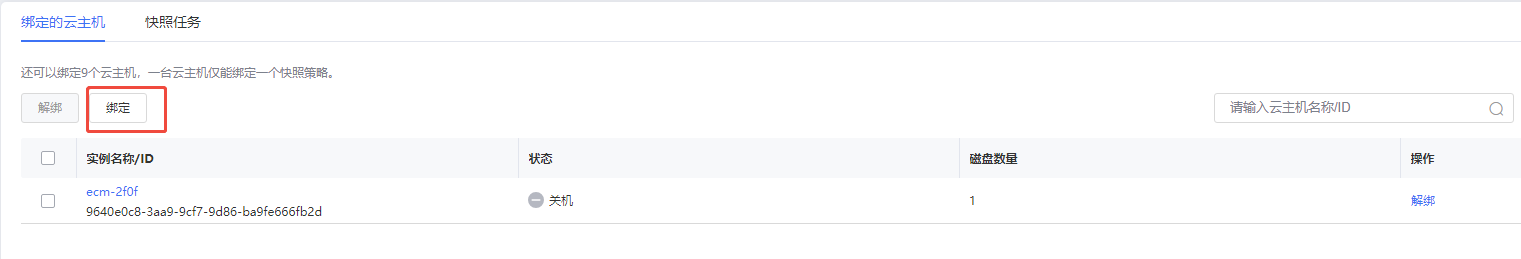 快照策略创建后,需要绑定云主机后策略才能正常执行。云主机绑定后可以进行解绑。