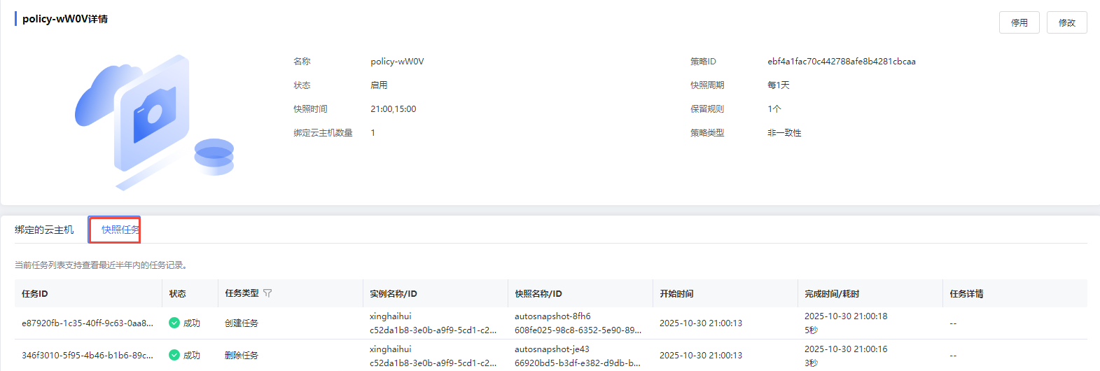 在云主机快照策略列表中选择要进行操作的快照,点击策略名称进入详情页。