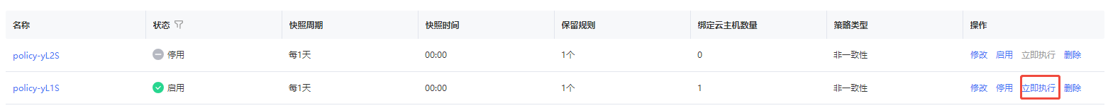 在快照策略列表,选择“启用”状态的策略,在操作栏点击“立即执行”按钮。