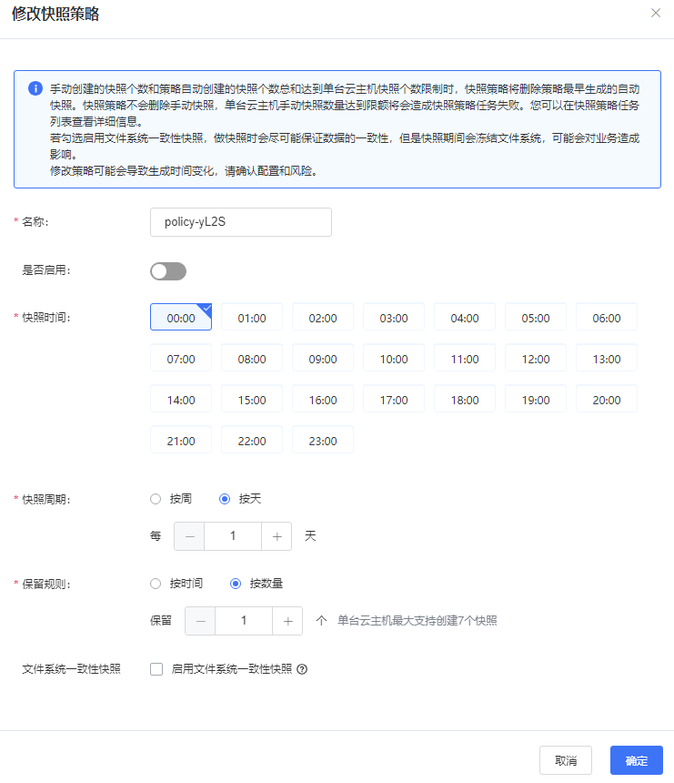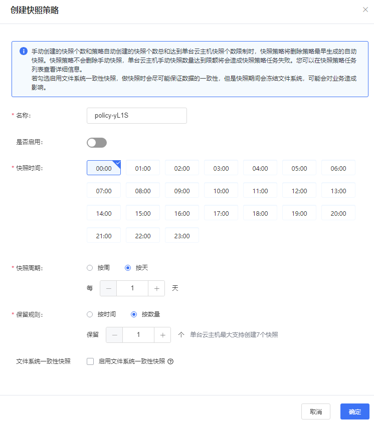 云主机快照策略通过创建策略并绑定云主机后,实现定时创建云主机快照。云主机快照同时支持按数量和时间保留策略。