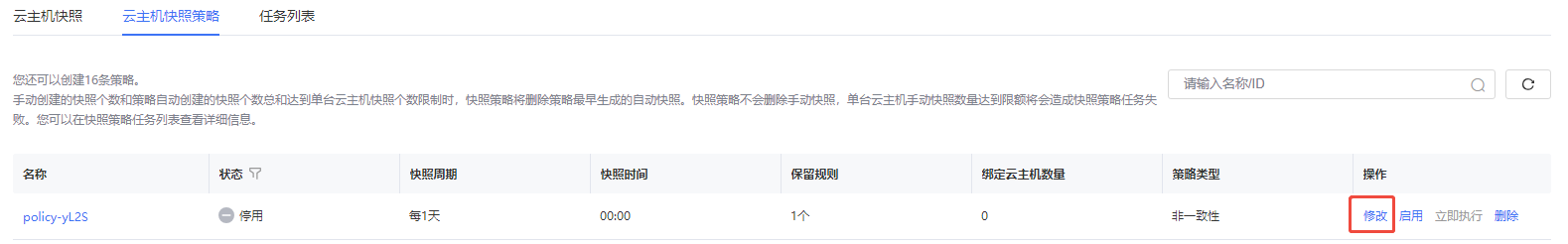 在云主机快照策略列表中选择要进行操作的快照,点击右侧“操作”中的“修改”。