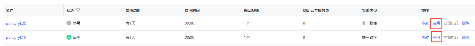 用户可以手动对快照策略进行启用与停用。启用的快照才可用,停用的快照不可用。