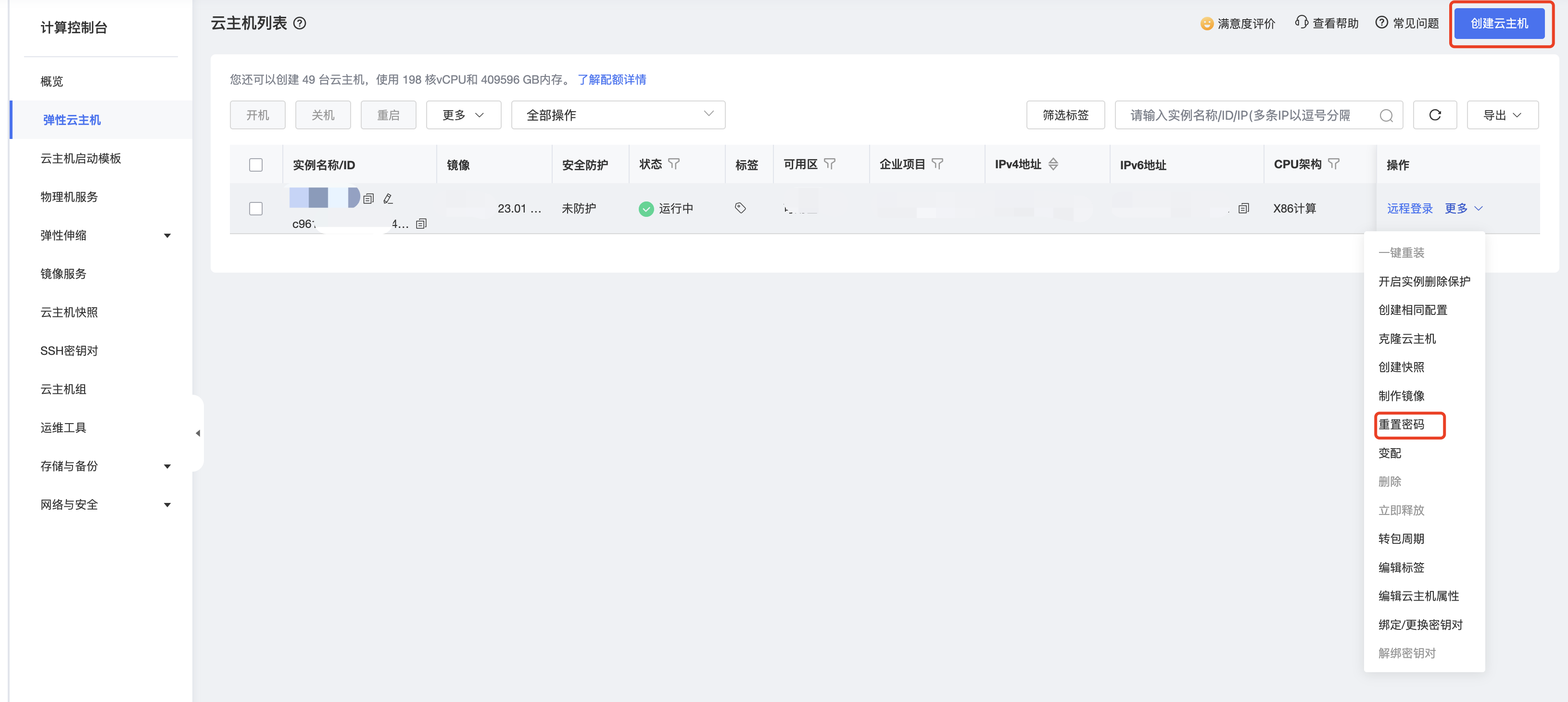 在云主机控制台,选择您购买云主机的地域,点击云主机的操作-更多-重置密码。