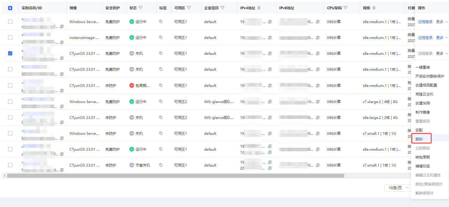 登录天翼云弹性云主机控制台,选中需要删除的弹性云主机。