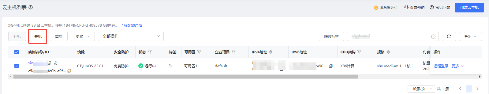 只有按量计费类型弹性云主机支持删除操作,弹性云主机只有在关机状态才可以删除,首先点击弹性云主机列表左上角的关机按钮。