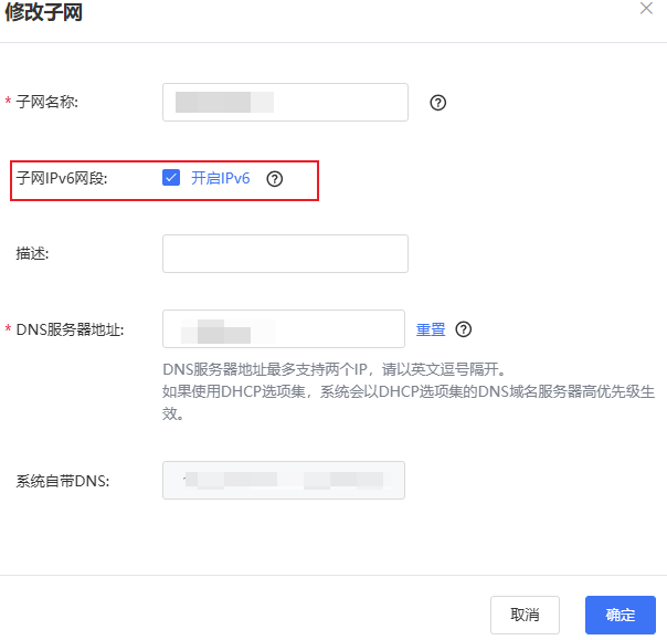 若当前子网未开启IPv6,如需开启可点击子网列表-操作列-“修改”按钮,在修改子网弹窗中勾选“子网IPv6网段”复选框,点击“确定”,即可开启子网IPv6网段。