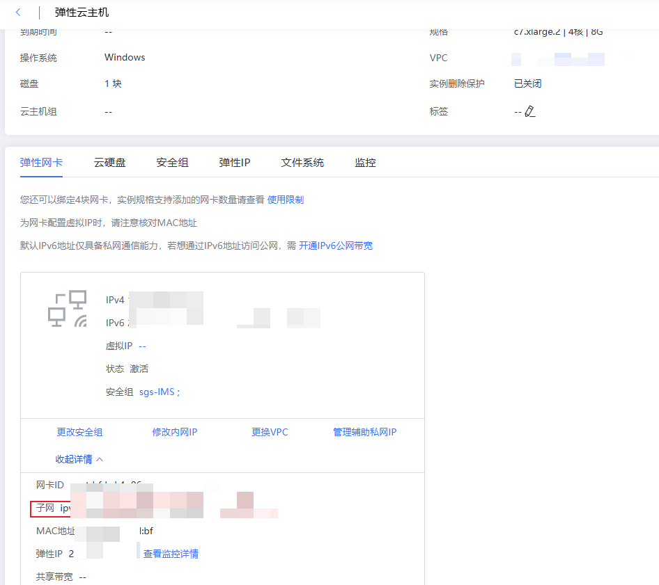 在云主机详情页-弹性网卡页签中,点击“展开详情”,查看云主机的子网名称。