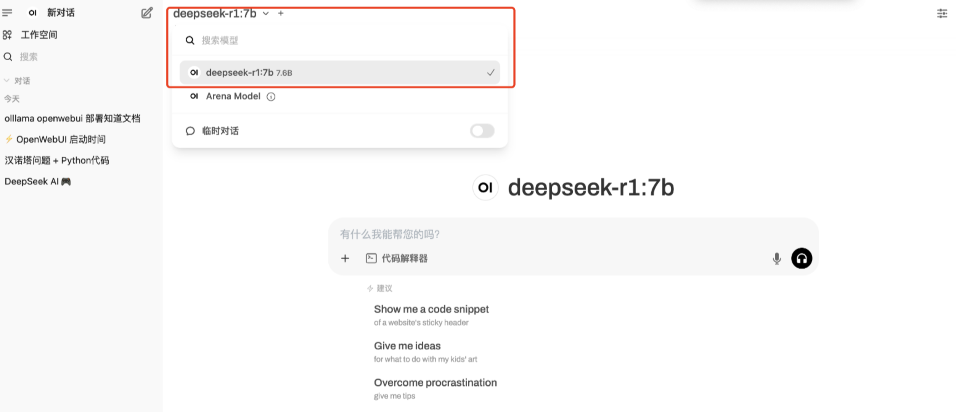 单机版 Deepseek GPU 云主机在完成部署后,会自动匹配云主机本地模型,刷新进入首页,可以看到,模型下拉列表中,可以选择我们部署的deepseek-r1 模型。