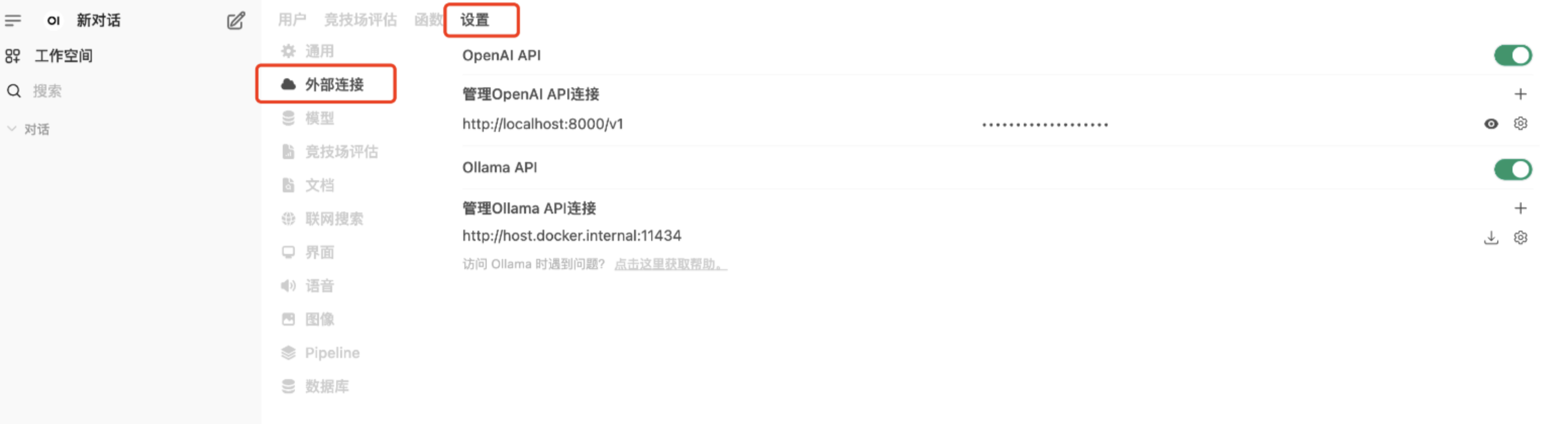 您可以主动设置您的模型连接,以体验任意第三方连接。以ollama和vllm提供的服务为例,进入“管理员面板” -> “设置” -> “外部链接”,如果使用的 vllm 则填入您的vllm地址和 --api-key,如果使用ollama 则填入您的ollama地址,点击保存后即可使用模型。