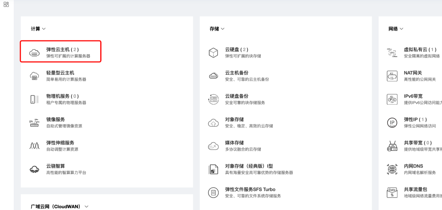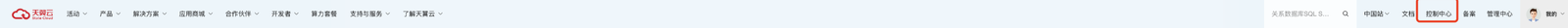 点击天翼云门户首页的“控制中心”,输入登录的用户名和密码,进入控制中心页面。