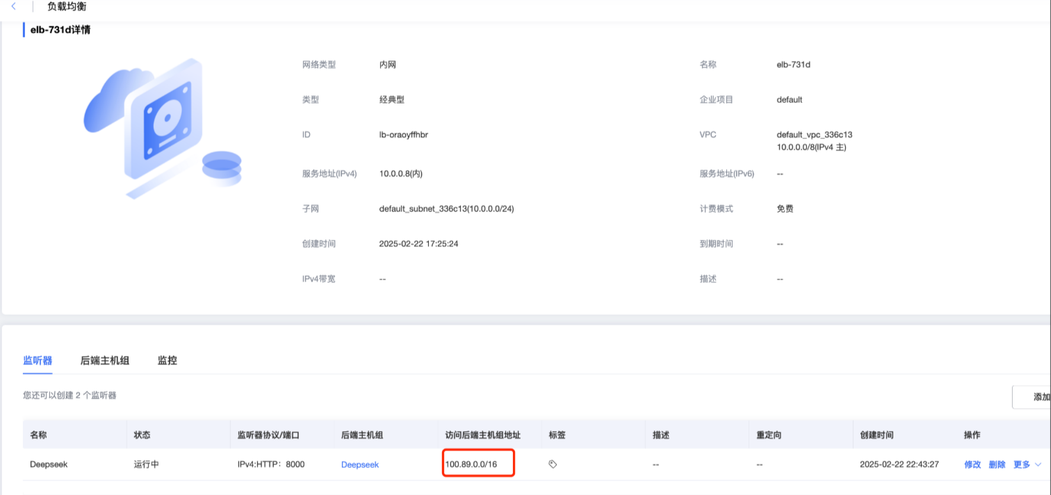此时监听器列表中,我们可以看到访问Deepseek服务器的主机组地址为 “100.89.0.0/16”,我们需要在Deepseek集群的安全组中,为vllm端口配置此地址的白名单。