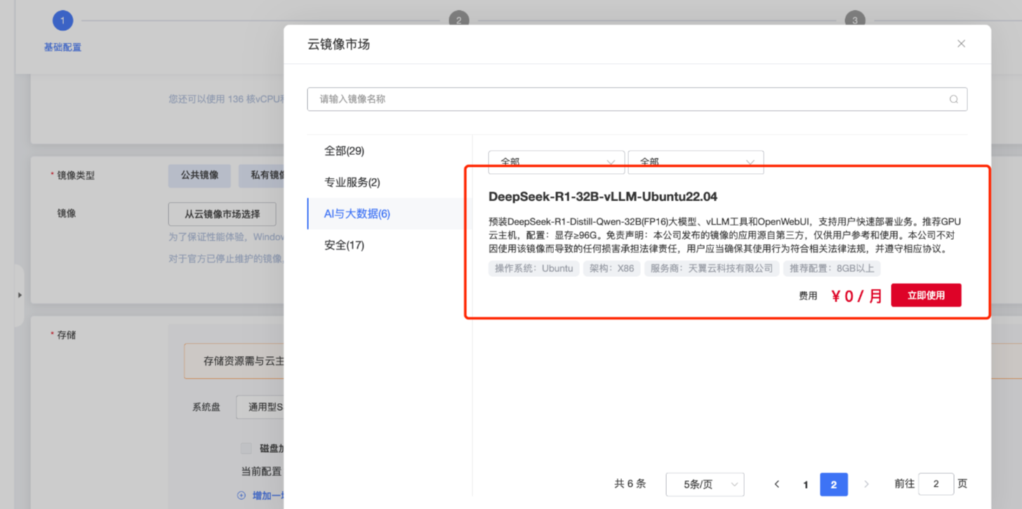 “镜像类型”选择“镜像市场”,在云镜像市场中选择预置了DeepSeek R1模型的DeepSeek-R1-32B-vLLM-Ubuntu22.04镜像。