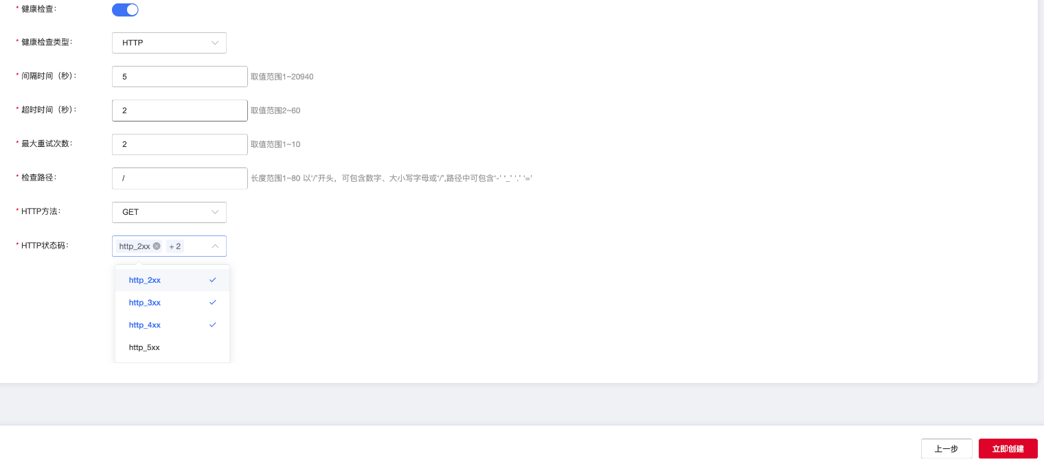 进入下一步,创建健康检查。这里我们通过 HTTP 进行健康检查,返回码部分选择 2xx、3xx、4xx。