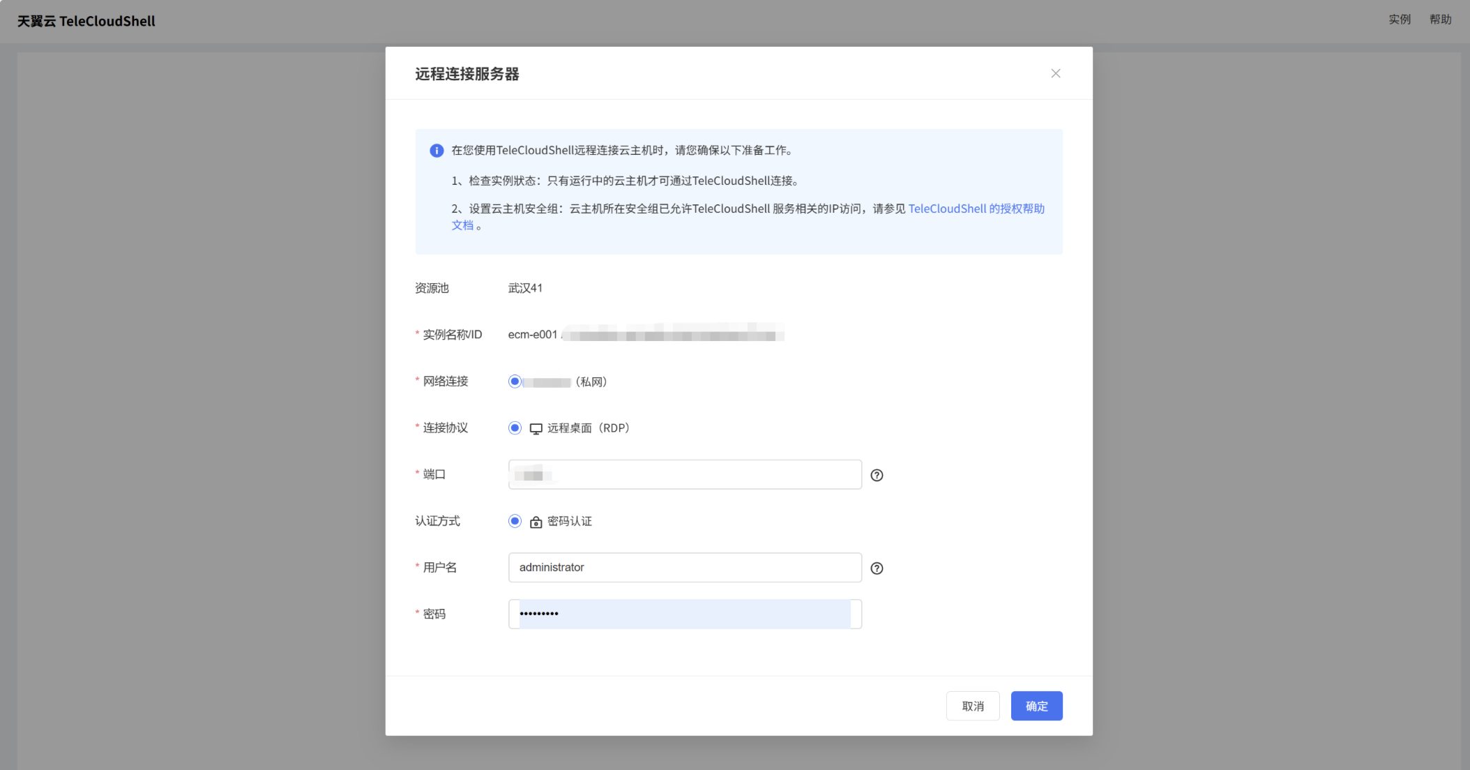 在TeleCloudShell登录页面,完成云主机连接信息的配置,点击“确定”。