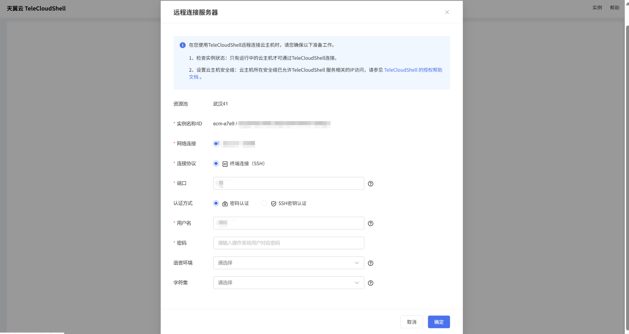在TeleCloudShell登录页面,完成云主机连接信息的配置,点击“确定”。
