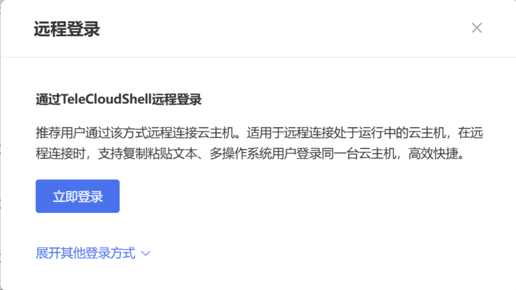 单击通过TeleCloudShell远程登录的“立即登录”。