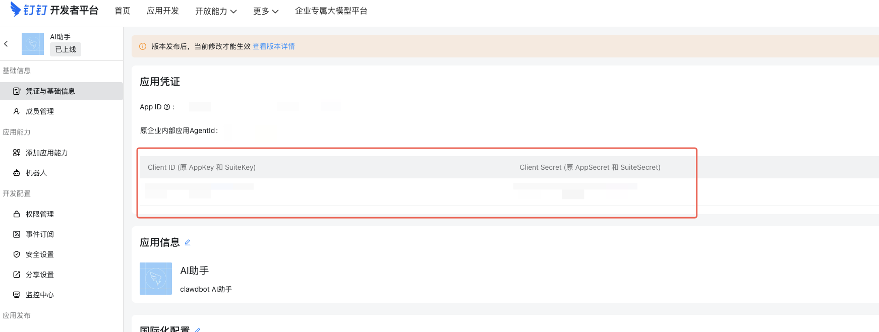 回到钉钉开发者平台,发布版本。