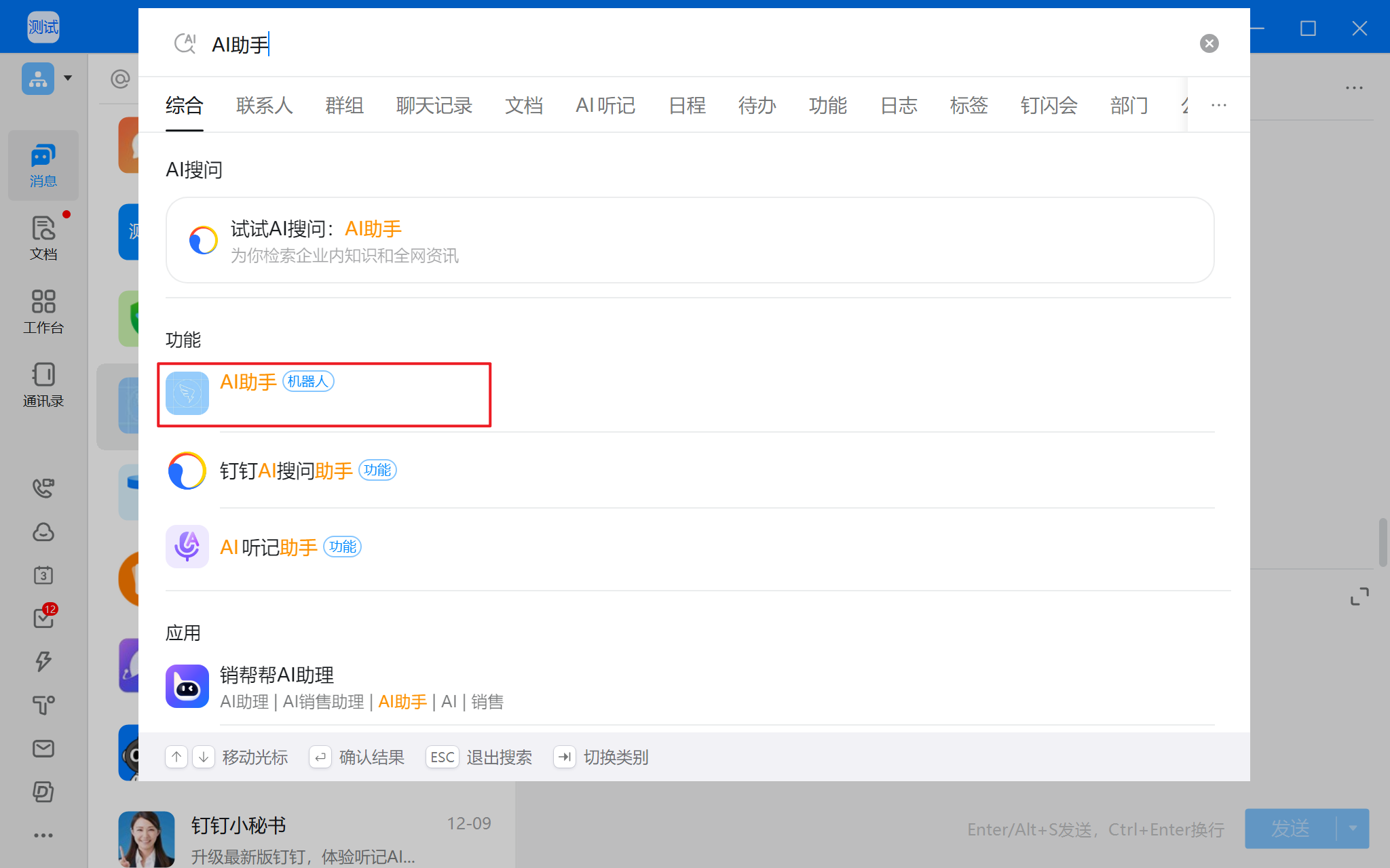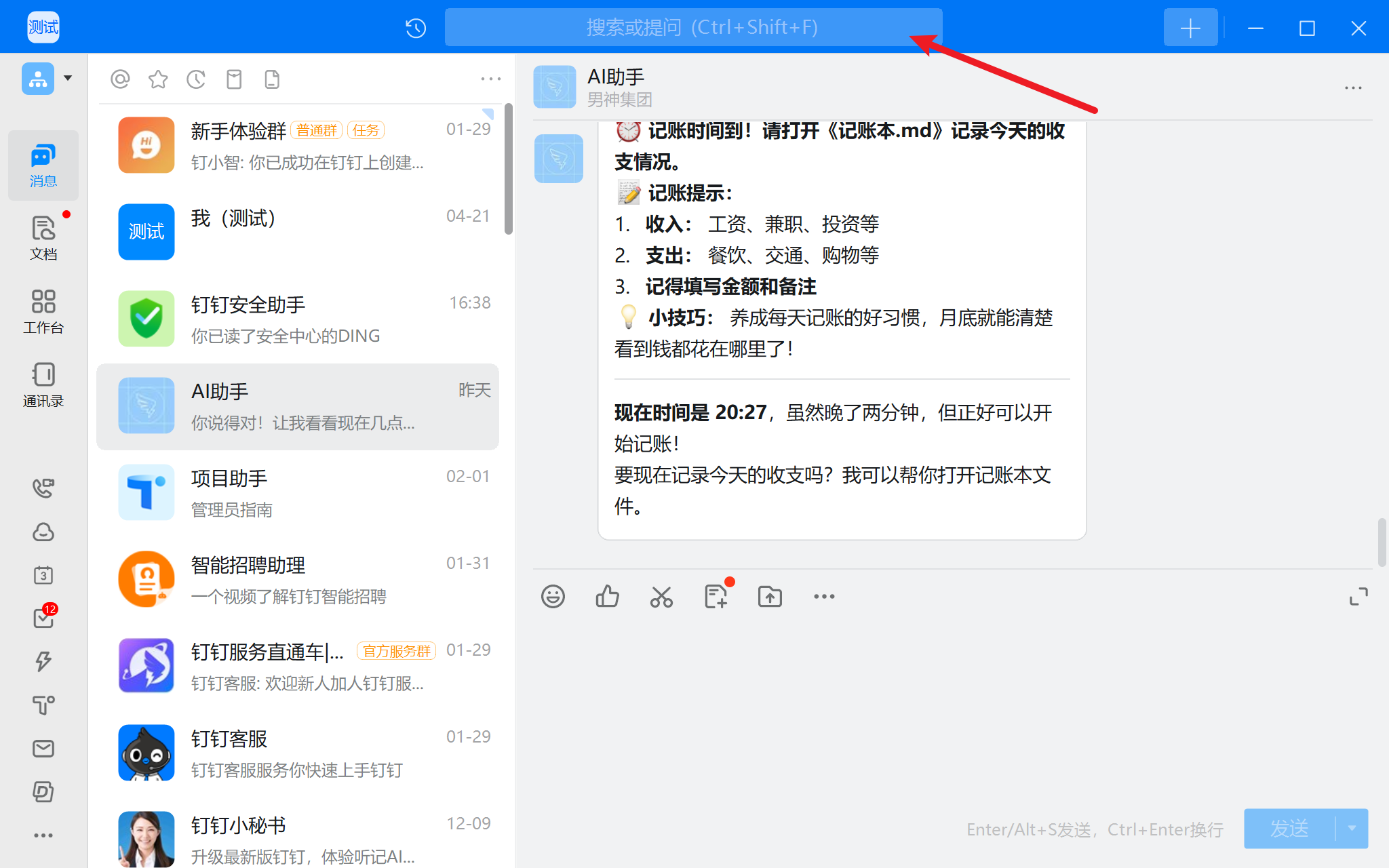 发布后,返回钉钉聊天窗口,在顶部搜索栏中搜索应用名称。