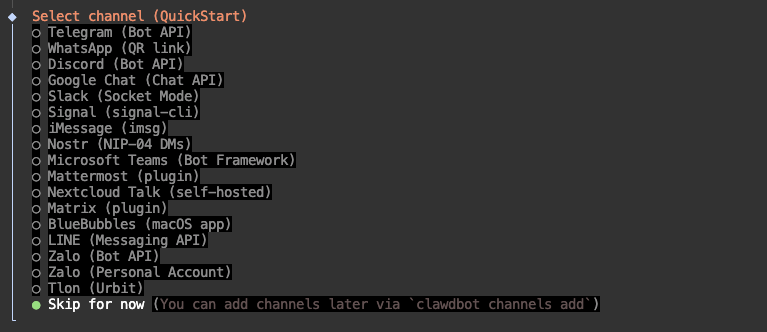 选择和Moltbot通信的软件,这里先跳过,选择“Skip for now”。