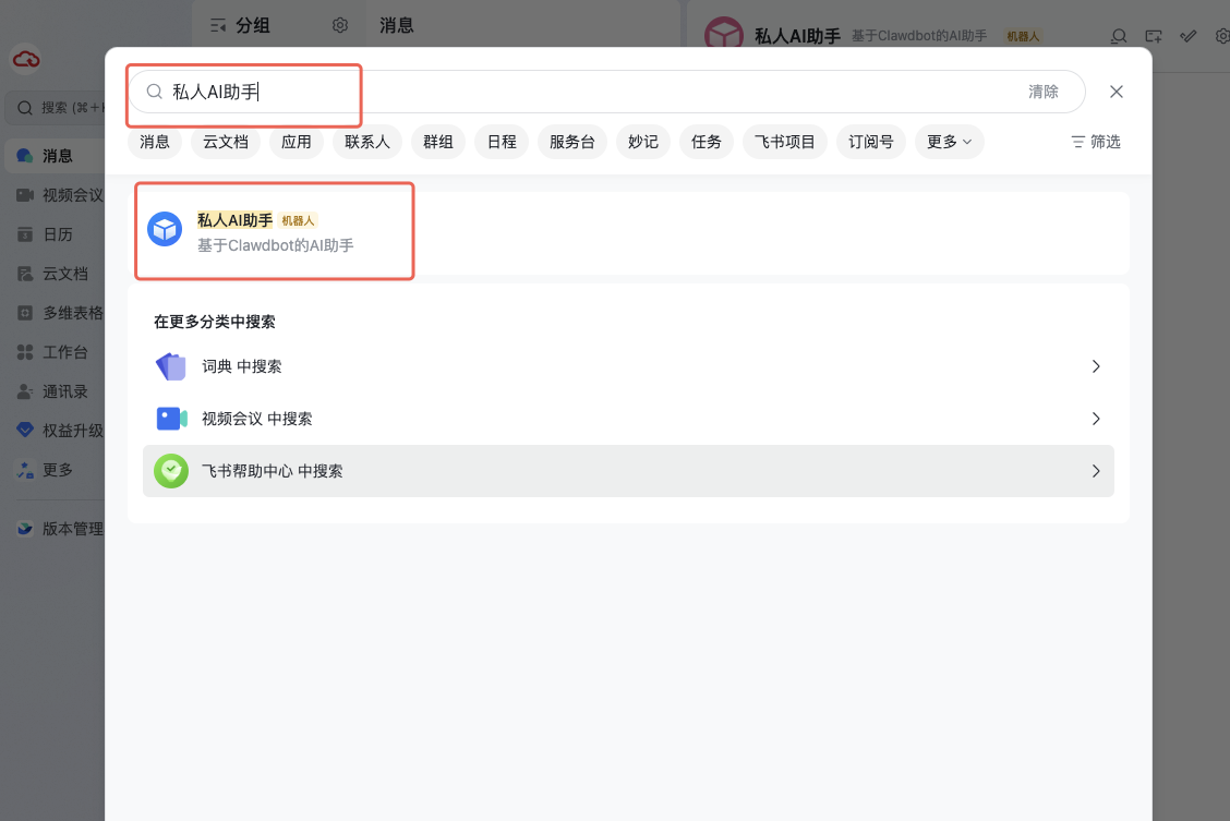 飞书机器人已创建成功,在飞书搜索栏中搜索机器人应用名称。