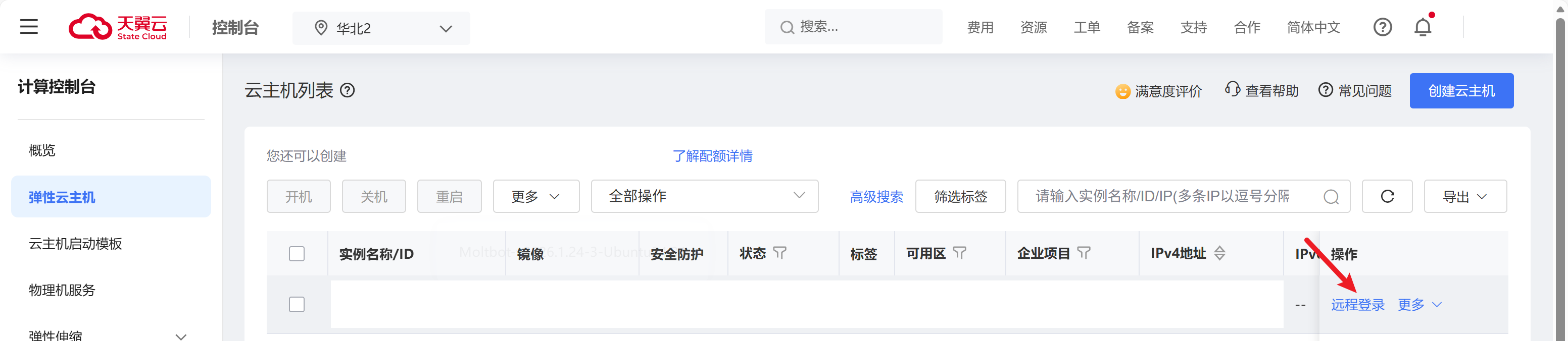 登录目标云主机。登录天翼云官网,进入计算控制台,点击远程登录按钮。