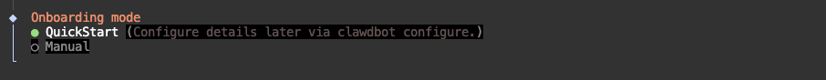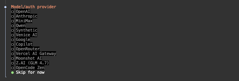配置模型供应商。如果已经订购上述供应商的大模型接口,则选择对应选项,如果使用私有化部署的大模型,选择“Skip for now”,初始化结束后,通过修改~/.clawdbot/clawdbot.json文件,进行大模型配置。