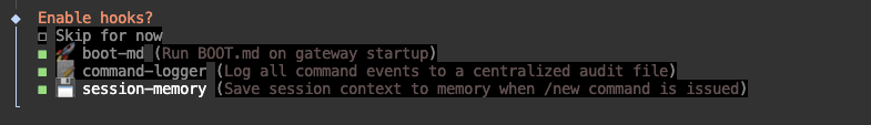 - command-logger:记录在 Moltbot 中执行的命令及关键操作并生成日志,方便后续排查问题、复盘操作;若注重隐私或无需留存操作痕迹,建议关闭。