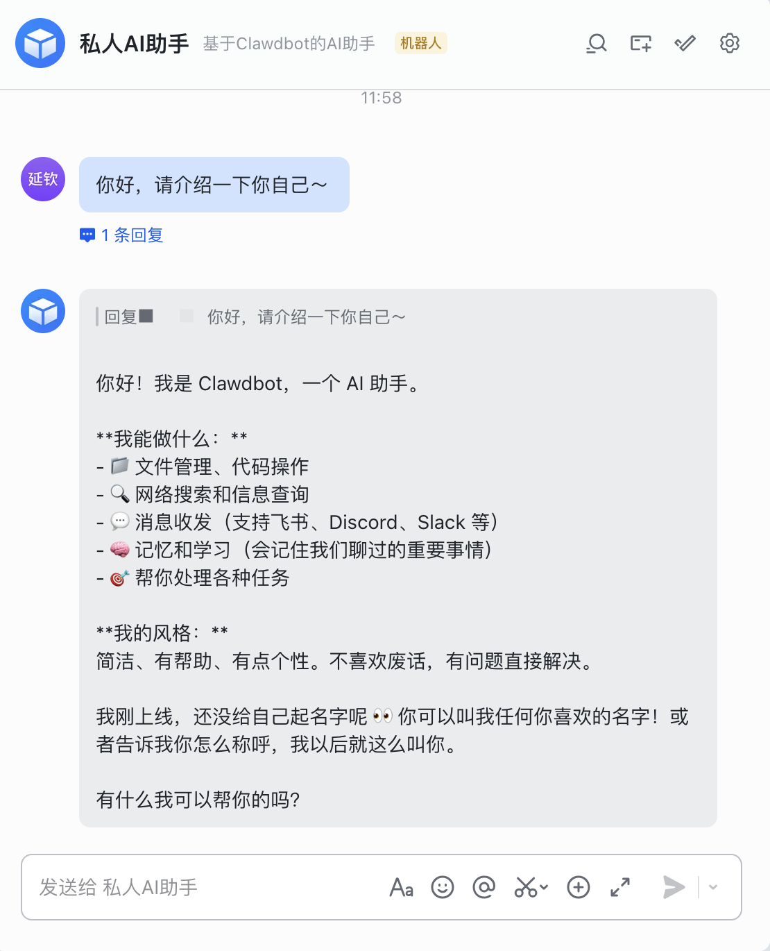 飞书机器人已创建成功,现在可以在飞书中和机器人对话,校验Moltbot功能是否正常。