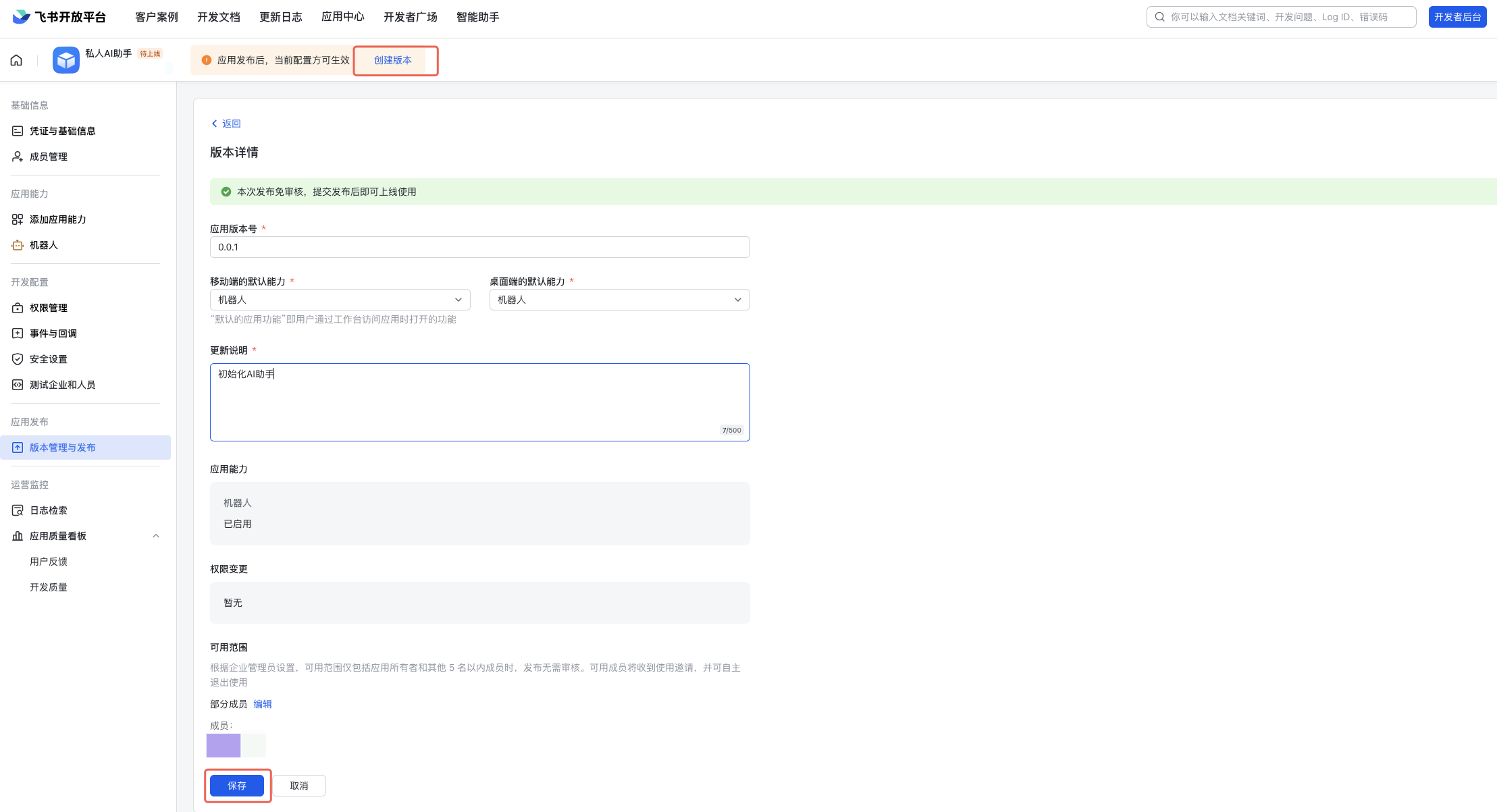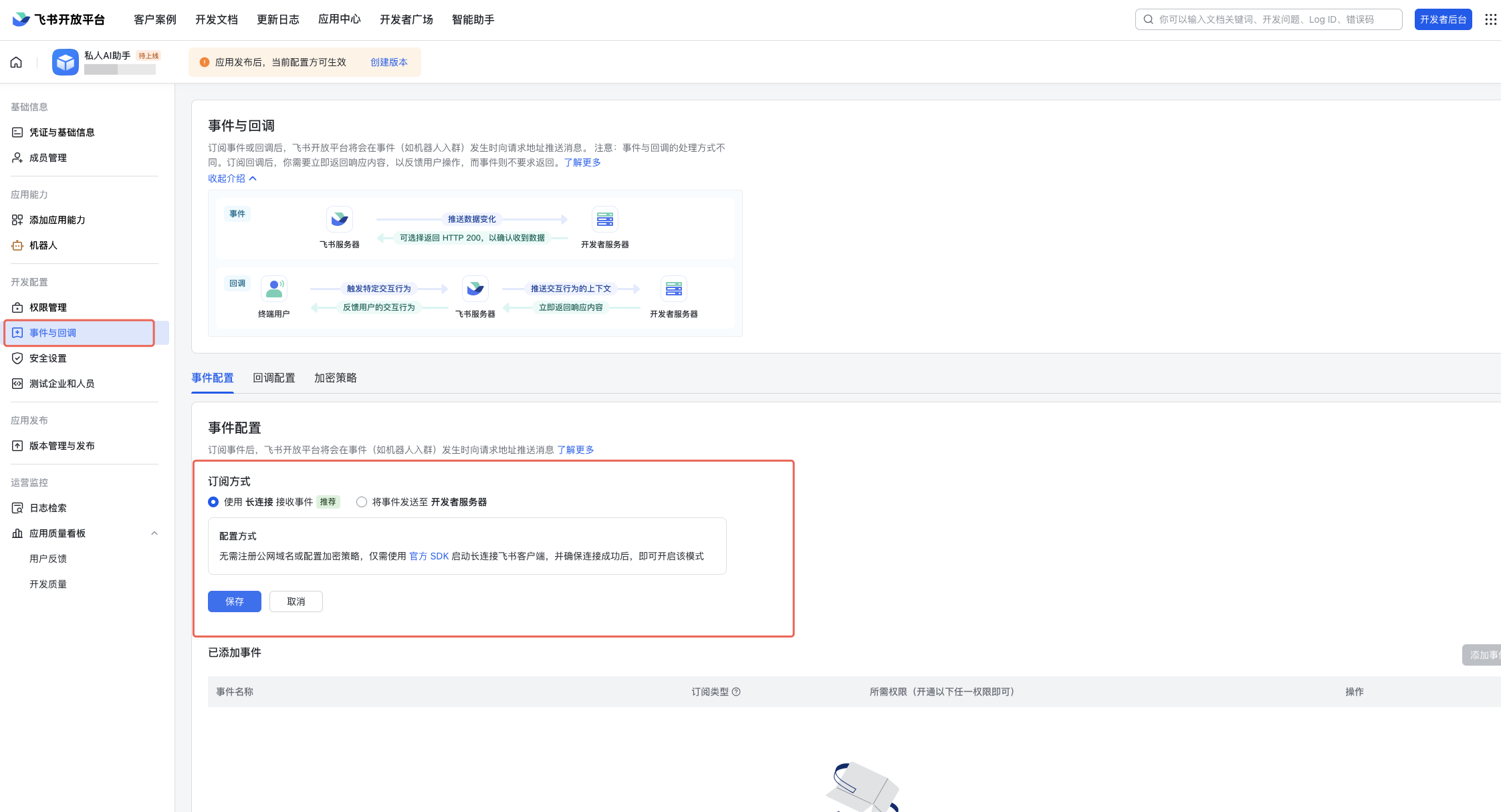 事件 说明 im.message.receive_v1 接收消息(必需) im.message.message_read_v1 消息已读回执 im.chat.member.bot.added_v1 机器人进群 im.chat.member.bot.deleted_v1 机器人被移出群 配置完成后,进行发版