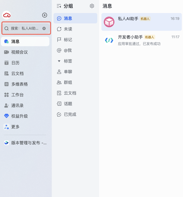 现在可以在飞书中和机器人对话,开启全新AI助手体验。