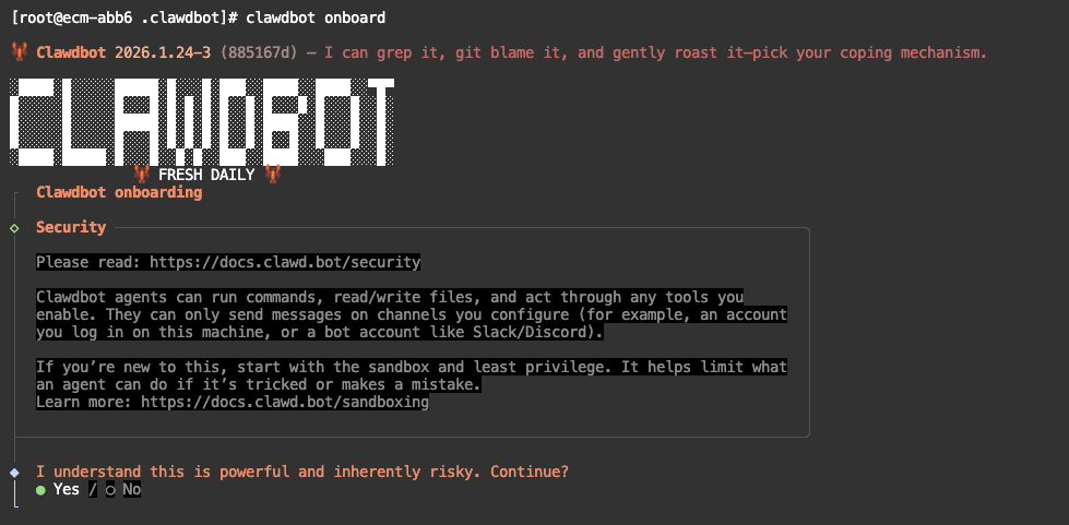 clawdbot onboard风险确认,选择“Yes”。
