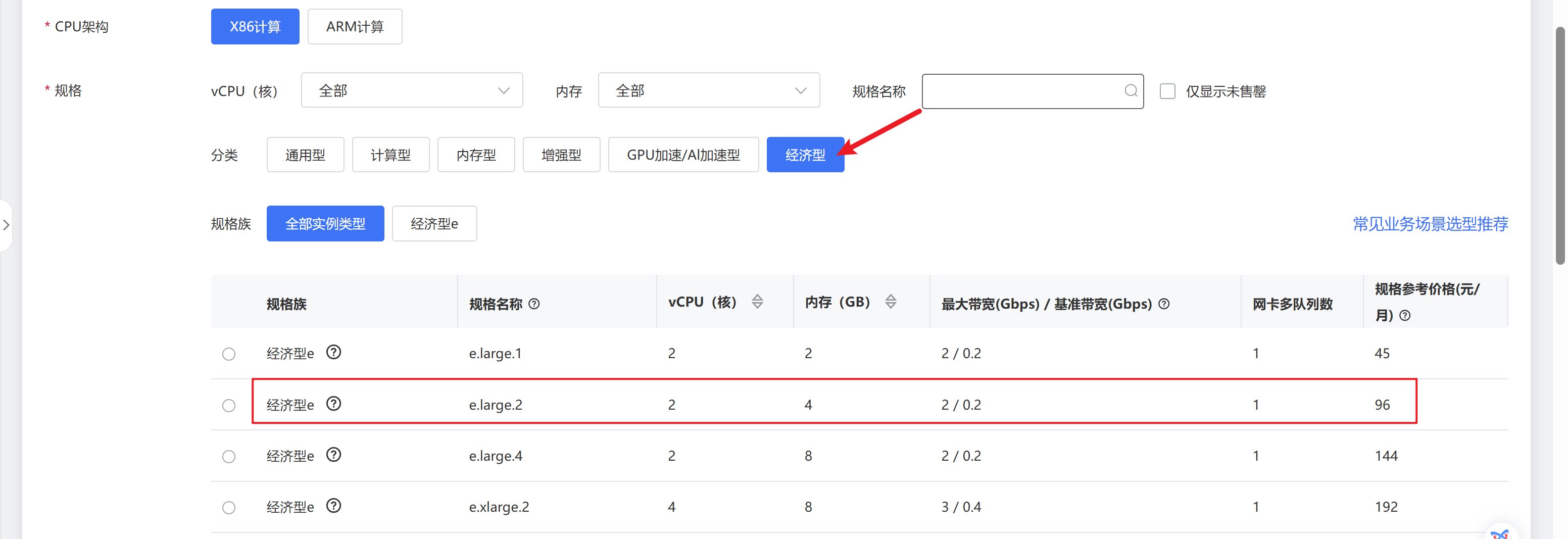 CPU架构选择“X86计算”,规格-分类选择“经济型”,云主机规格推荐使用【经济型-e.large.2】的规格。